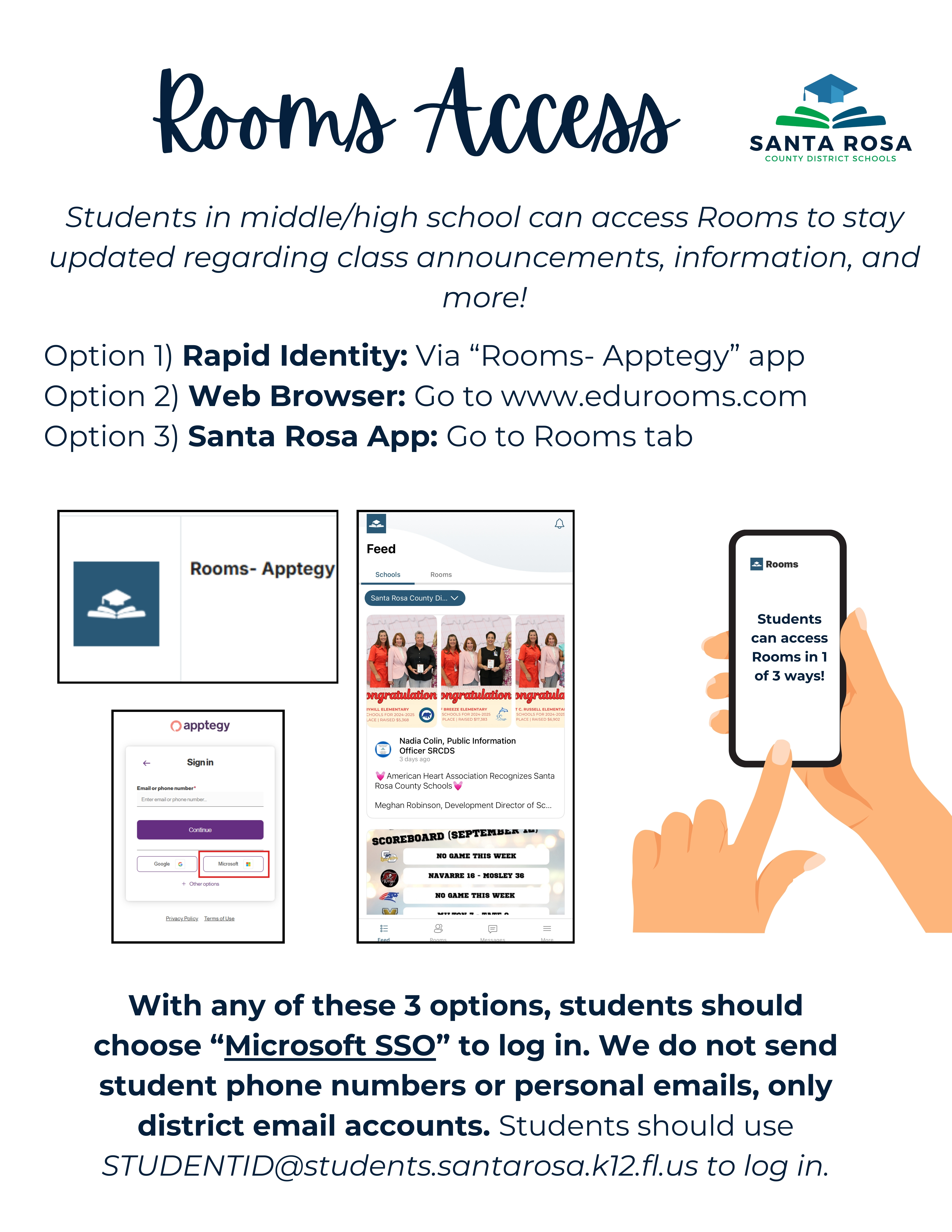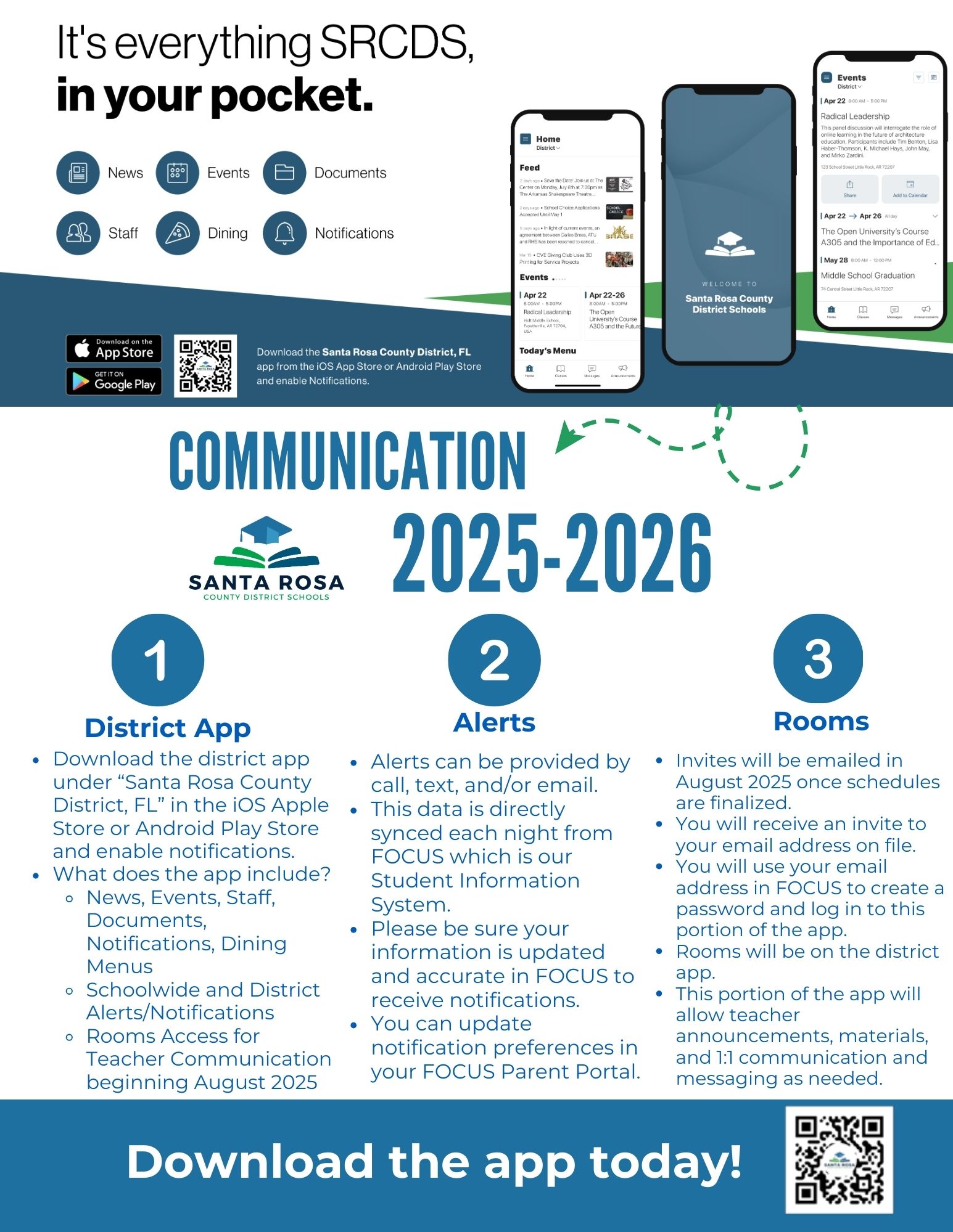 Parents should download the Santa Rosa County District, FL app (below). Once you have the app, parents will log in via phone number or email address on file to access Rooms and the communication section of the app.